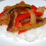 Stir fried beef sirloin, slow cooked with onion, tomatoes and peppers, served over a bed of hot cooked rice.