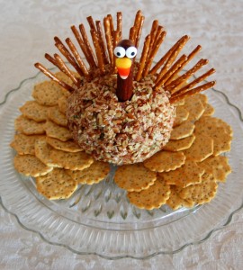 To make the turkey: Use pretzel sticks for the feathers, a pepperoni stick for the neck, a whopper candy for the head, a candy corn for the beak, and candy eyes. "Glue" with chocolate frosting.
