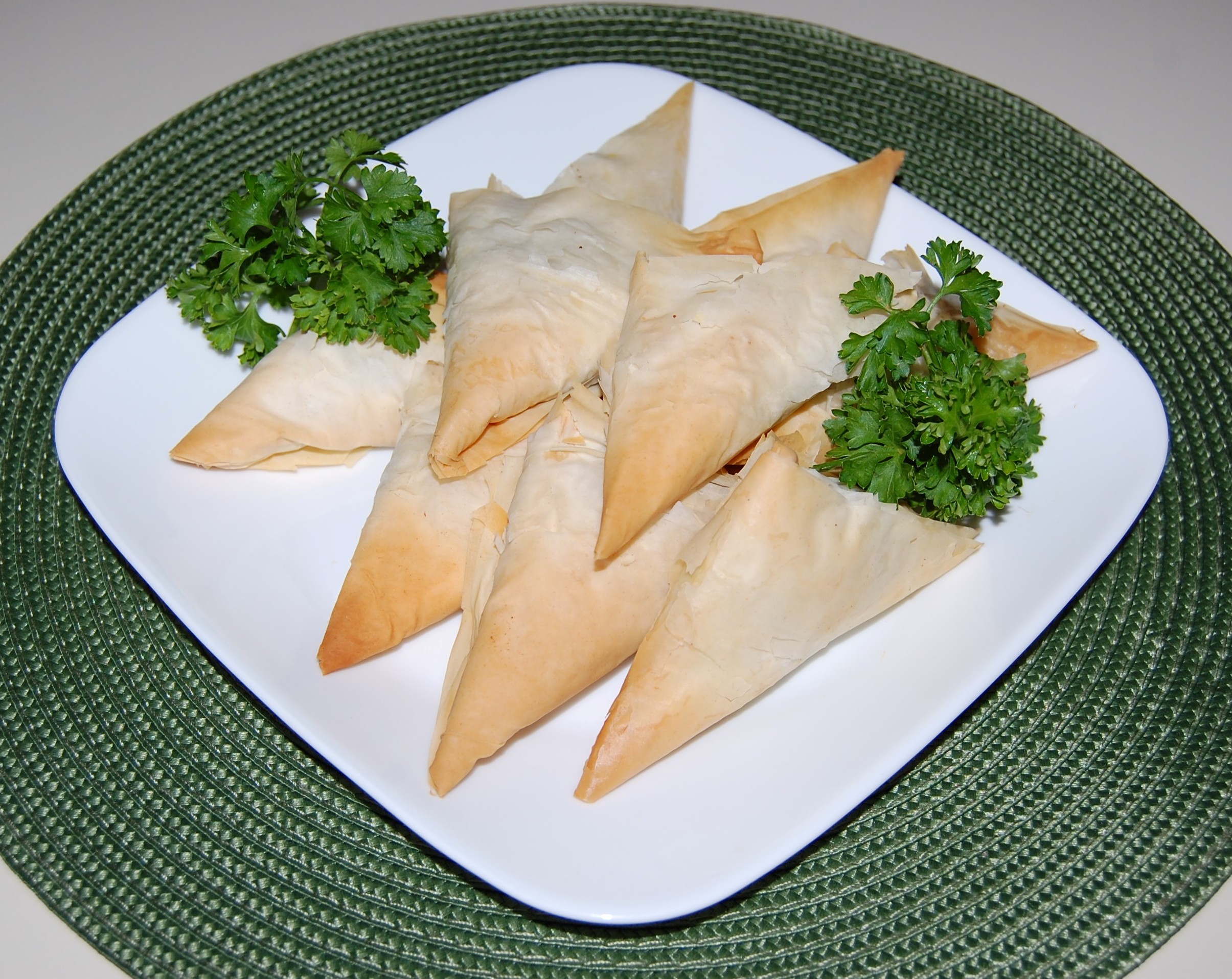 "An authentic Greek pie, stuffed with spinach, onion and cheese, neatly folded in phyllo dough then baked until crisp and flaky."