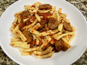 Strozzapreti pasta and spicy Italian sausage, served in a hearty red sauce, topped with freshly grated Parmigiano Reggiano cheese, Enjoy!