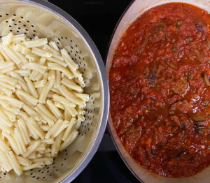 - PASTA: About 15 minutes before the sauce is done, cook the pasta in a large pot of salted boiling water according to the package instructions for al dente, about 7-9 minutes, and drain.