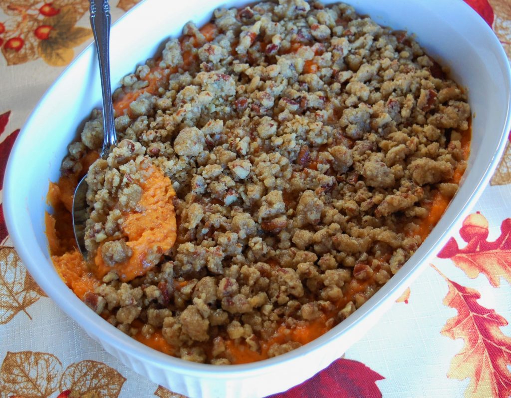 - PRALINE TOPPING: In a medium bowl, combine flour, brown sugar, melted butter, salt, and pecans, stir until moist and the mixture clumps together. Sprinkle mixture over the top of the sweet potatoes in an even layer. Bake for 25-30 minutes or until golden brown. Enjoy!!
