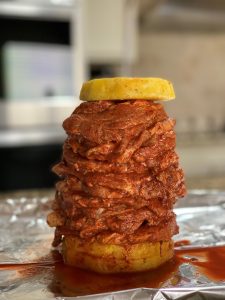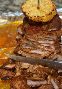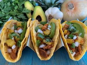 If you like authentic Mexican tacos, then you’re going to love our sweet and spicy street tacos al pastor! Marinated pork shoulder roasted on a vertical spit (skewer) served on warm corn tortillas with grilled pineapple, onions, avocado, cilantro, salsa verde, and lime.