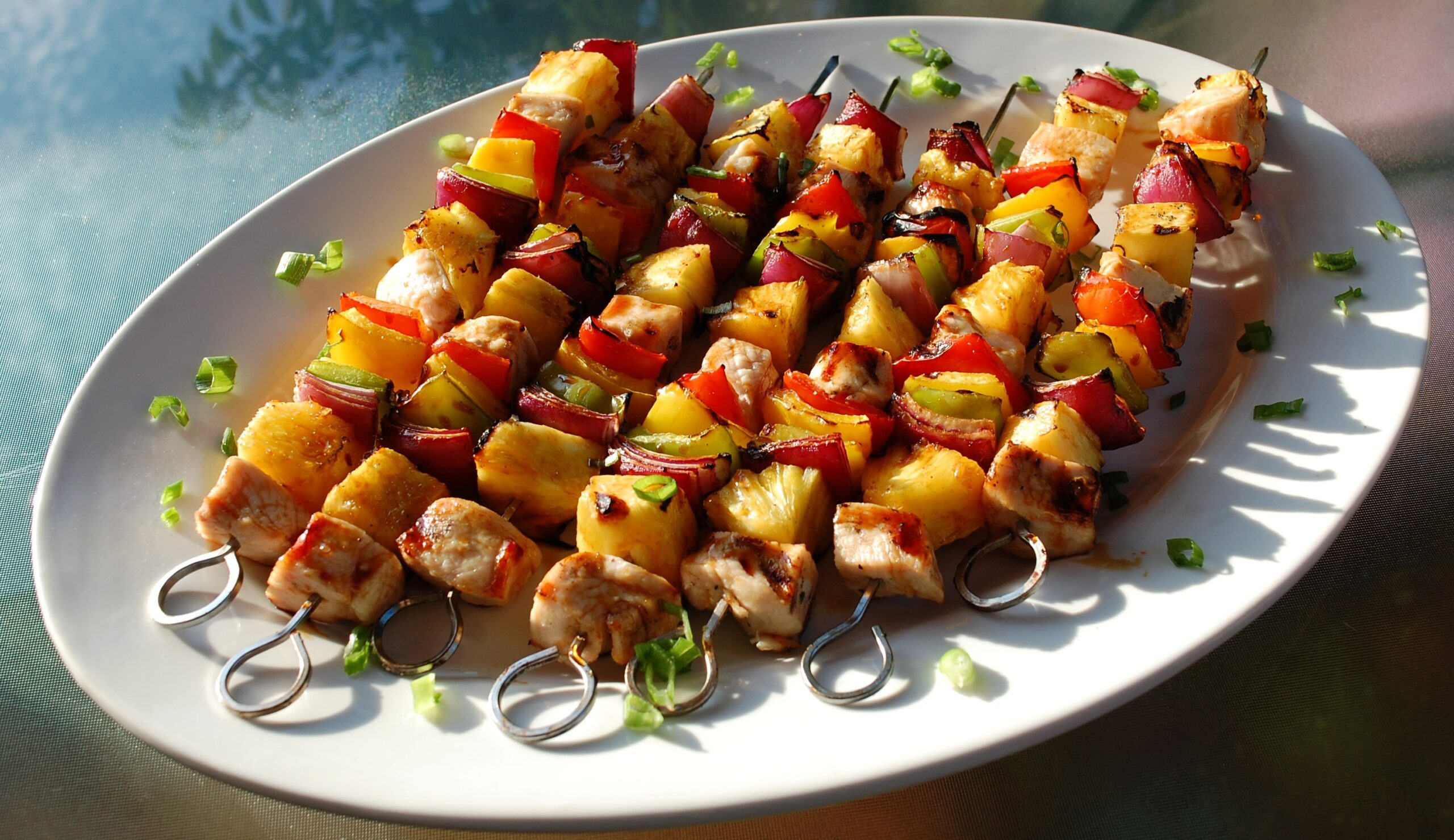 Marinated teriyaki chicken, colorful bell peppers, sweet pineapple, and red onions cooked over an outdoor grill. This dish SCREAMS summer!