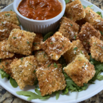 - Working in batches, dredge the ravioli in flour, dip into the eggs, then dredge in the panko mixture, pressing to coat.