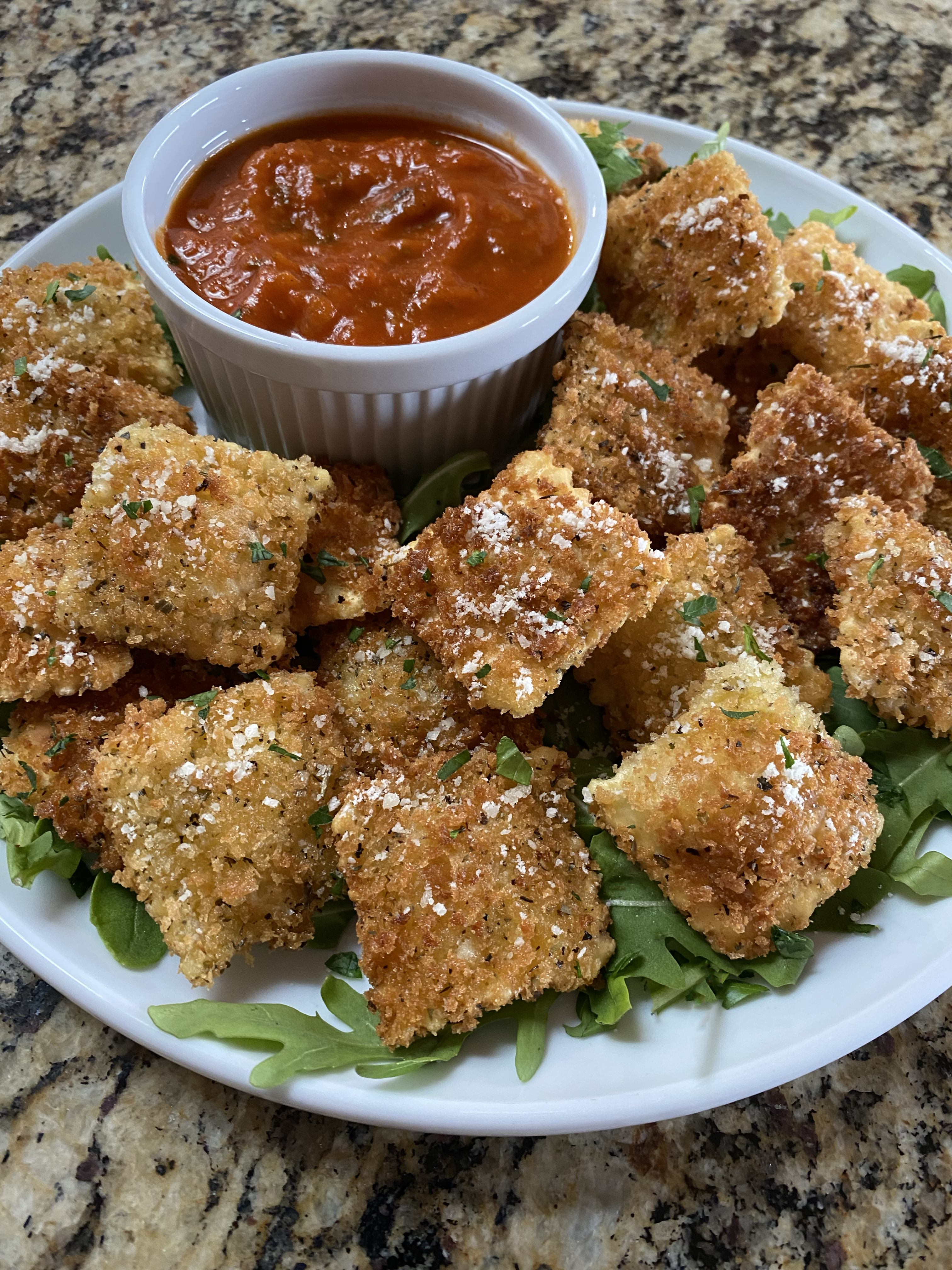 - Add 5-7 ravioli to the pot at a time depending on the size of your pot. Cook until evenly golden and crispy about 1-2 minutes. Transfer to a paper-towel-lined plate. Repeat with the remaining ravioli.