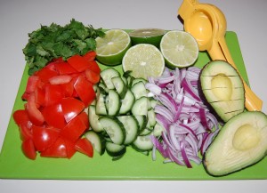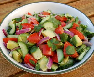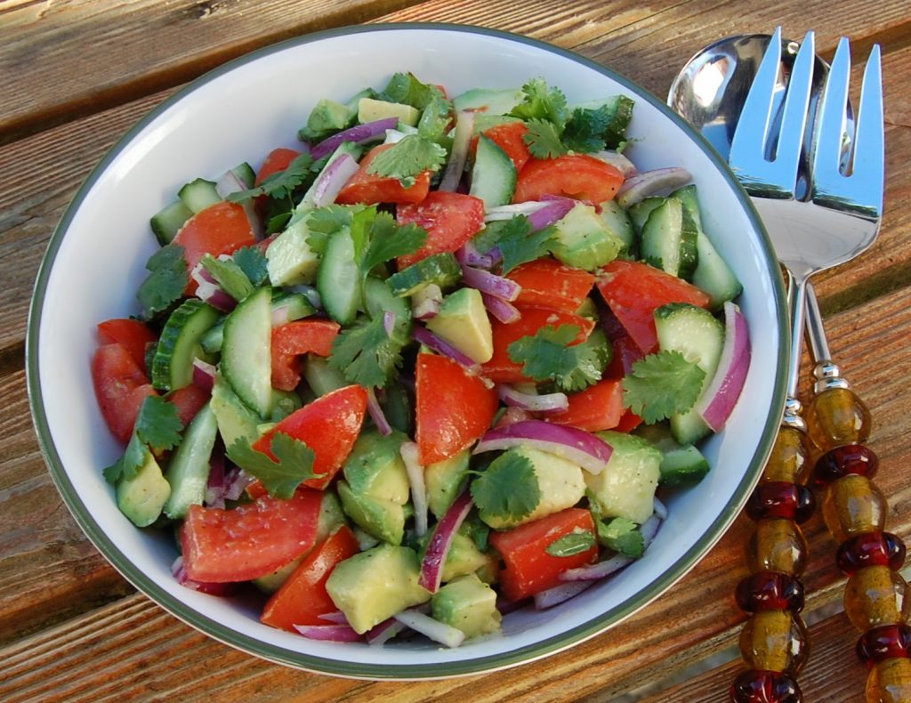 • In a large bowl, combine chopped tomatoes, sliced cucumber, diced avocado, sliced red onion, and chopped cilantro.