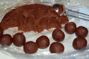 - Make a deep indentation with your thumb in the center of each dough ball.