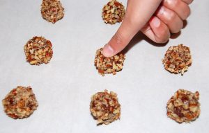- Shape the dough into 1-inch balls. Roll them one at a time in egg white, and then roll in chopped pecans, gently pressing into the nuts to evenly coat. Transfer to prepared baking sheets.