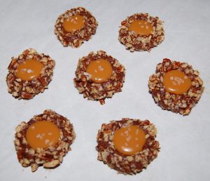 Decadent chocolate thumbprint cookies, rolled in chopped pecans, filled with salted caramel, then drizzled with semi-sweet chocolate.