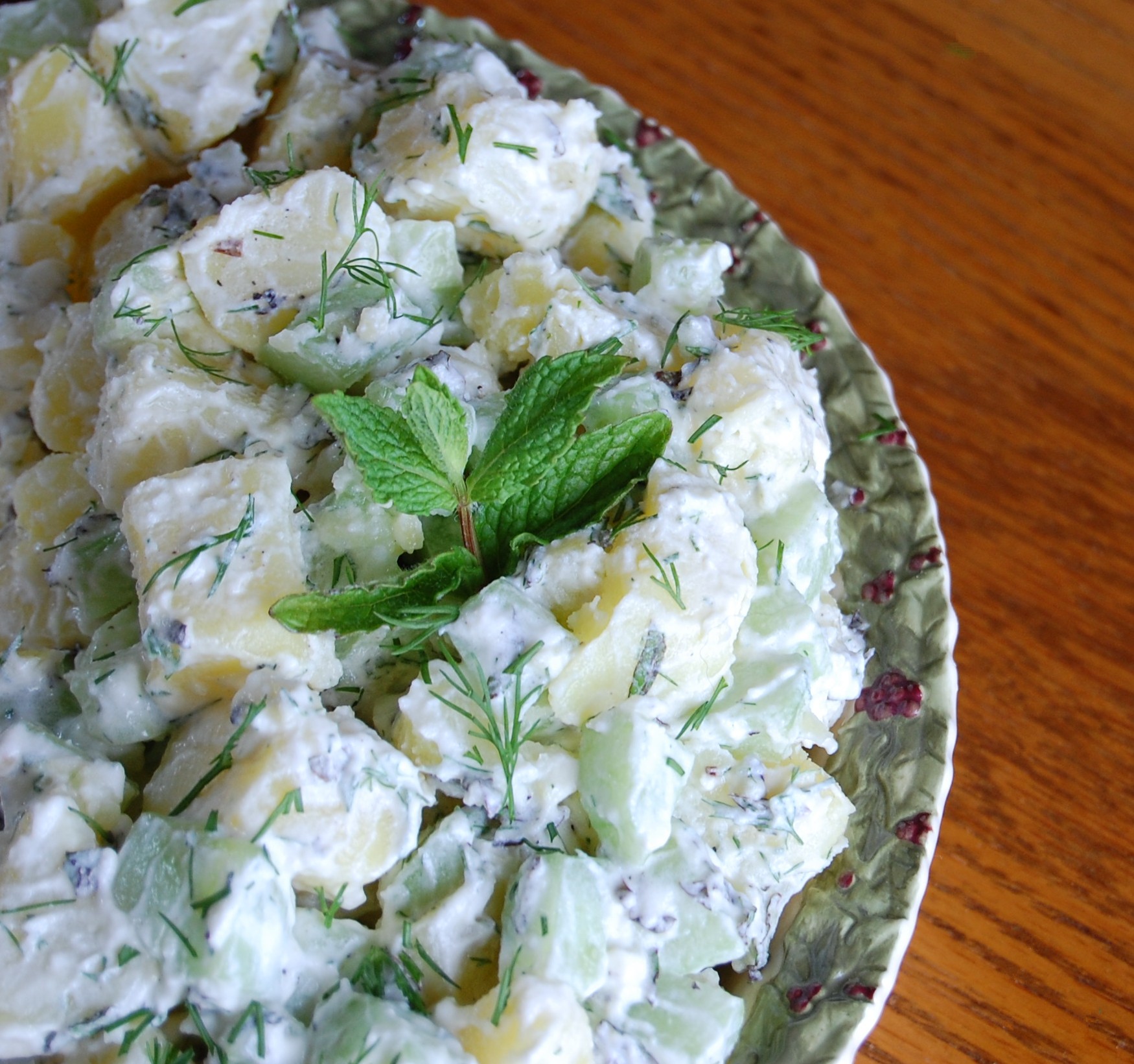 Yukon Gold potatoes, English cucumbers, garlic, dill and mint, tossed in a creamy yogurt dressing.