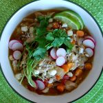 Our Slow Cooker Verde Chicken Pozole is a warm, comforting Mexican soup filled with shredded chicken (or pork), hominy, fire-roasted tomatoes, carrots, onion, and garlic in a rich, bold, green chile broth topped with crunchy radishes, cilantro, limes, avocado, and crumbled cotija cheese.