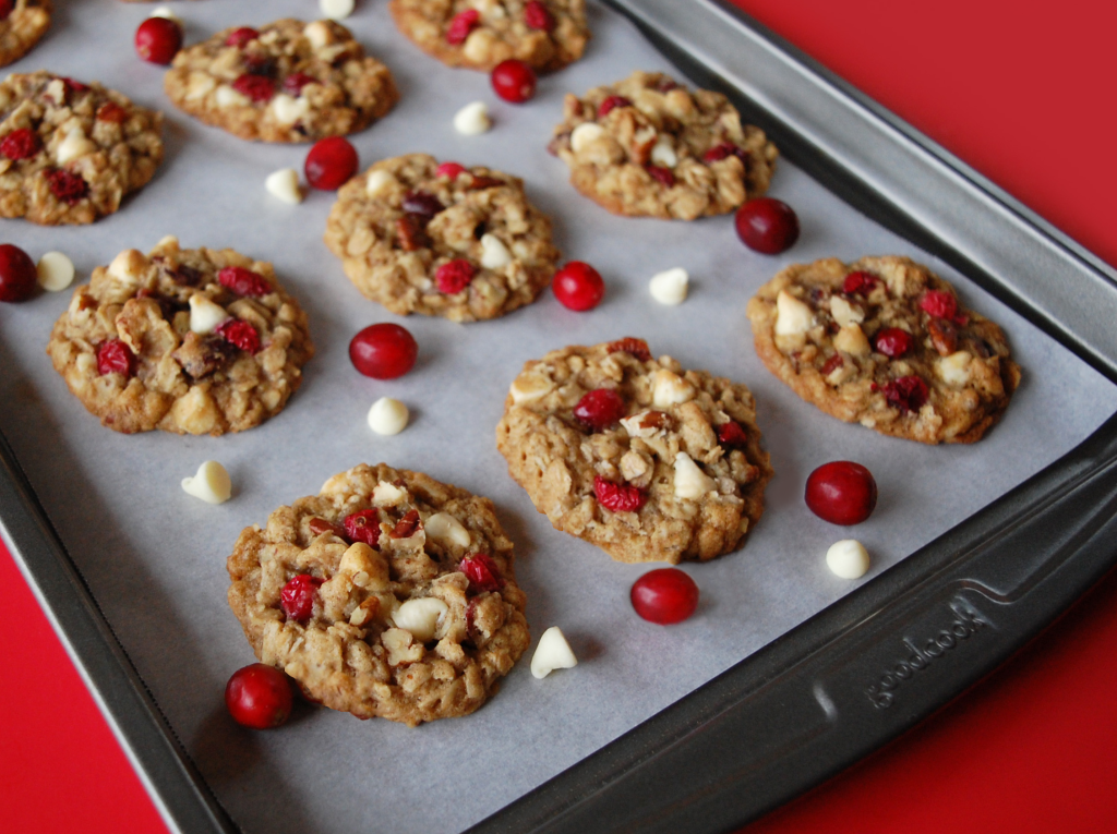 These delicious oatmeal cookies are loaded with white chocolate, fresh cranberries, oatmeal, pecans and a dash of cinnamon, Enjoy!
