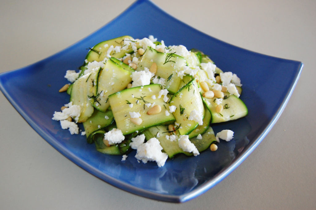 Fresh zucchini ribbons dressed in a dill vinaigrette then topped with crumbled feta cheese and toasted pine nuts.